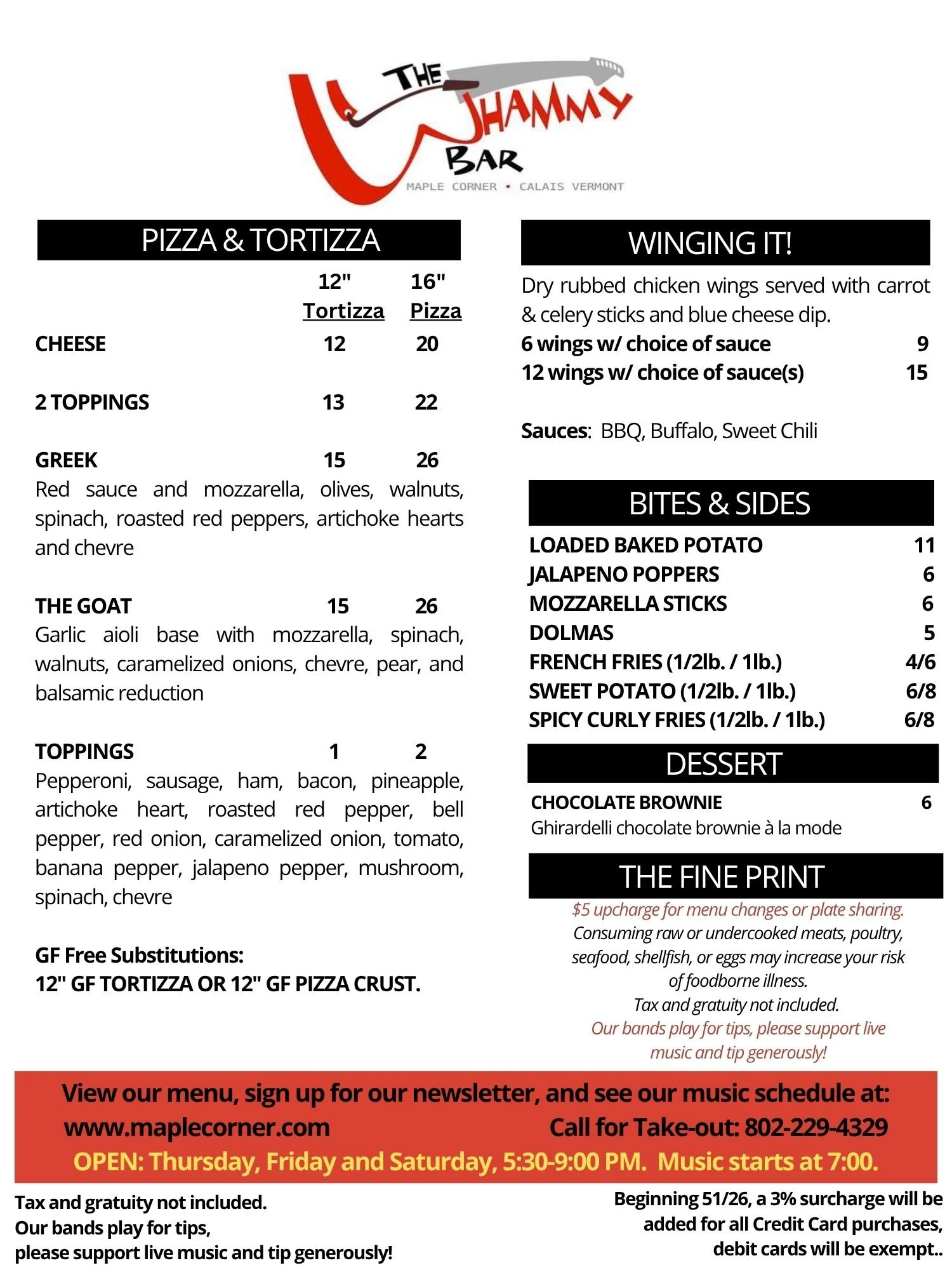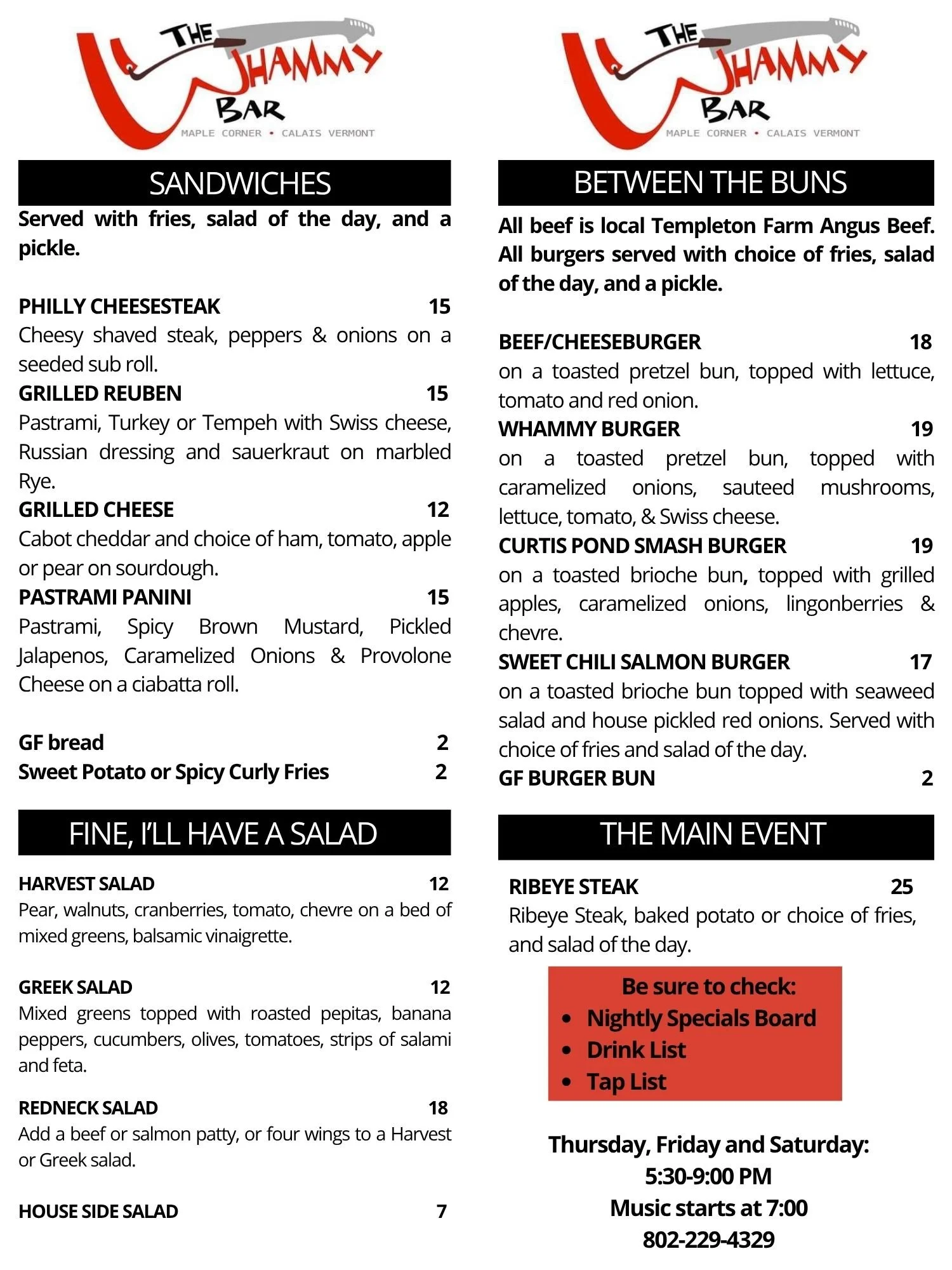 The Whammy Bar is open Thursday through Saturday 530 to 10pm, with the kitchen closing at 9. Our full menu, including specials, are available for take-out anytime we’re open!